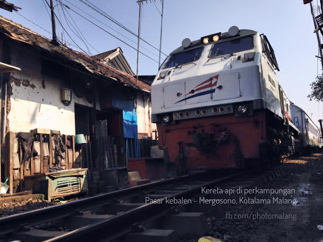 Photo ini diambil saat ada kereta api melintas. Lokasi tepatnya adalah di jalur rel kereta di perkampungan di daerah seputar pasar Kebalen Malang ( Mergosono ).