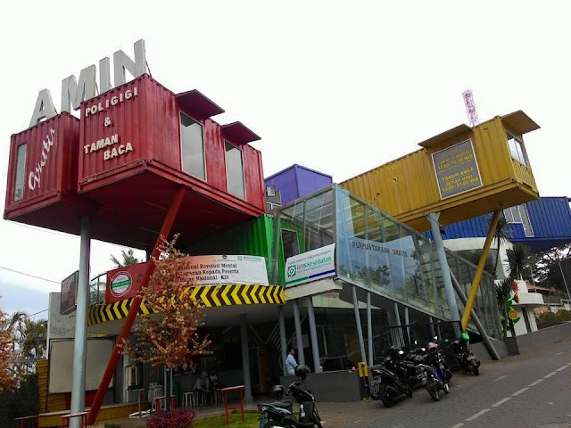 www.PhotoMalang.com - Kalau kamu berkunjung ke kota Batu, sempatkan untuk mampir ke salah satu perpustakaan ( Taman Baca ) unik. Kenapa unik karena tempat ini dibuat dari 7 kontainer yang berbeda ukuran. Posisi kontainer tersebut ada di bagian atas dan di sangga permanent dengan balok besi dibawahnya. Selain sebagai tamn baca tempat ini juga merupakan Poligigi umum dan gratis.