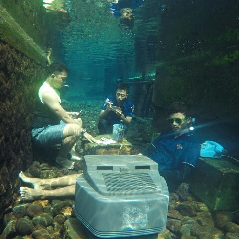 www.PhotoMalang.com - Bosan dengan wisata air standart, coba main ke Telaga Sari Sentul. Di telaga ini mempunyai daya tarik tersendiri, airnya yang jernih dari sumber air, dan bebatuan di bawahnya membuat lokasi ini unik dan menarik untuk dikunjungi. Disana kita bisa masuk ke dalam telaga dan berfoto seolah-olah kita ada di daratan, properti TV telephon dll sudah disediakan.