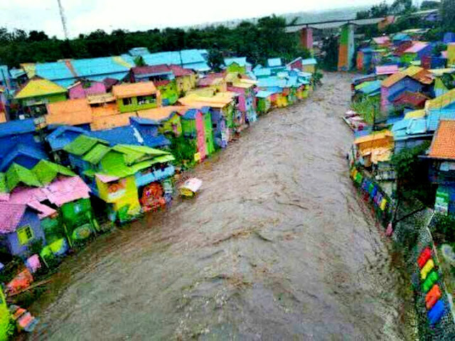 Salah satu lokasi yang kebanjiran adalah Kampung Warna Warni, terliht pada foto sungai yang melintasi meluap dan mengakibatkan air tinggi. Beberapa rumah sempat ada yang roboh karena konstruksi bangunan yang tidak kuat.