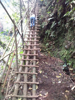 Setelah sampai di lokasi pintu masuk, kita masih harus berjalan menuju tkp cobannya. Perjalanan di jalan setapak berliku bahkan naik turun dengan tangga darurat dari bambu.