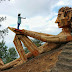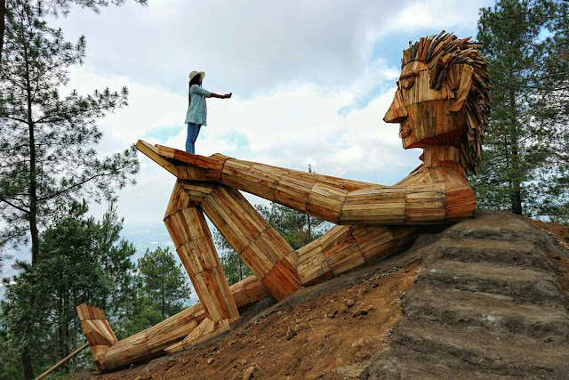 Patubg dari kayu yang disusun menyerupai manusia terlihat keren. Patung tersebut dengan pisisi tangan yang terbuka, dimanfaatkan untuk berfoto berdiri/duduk.
