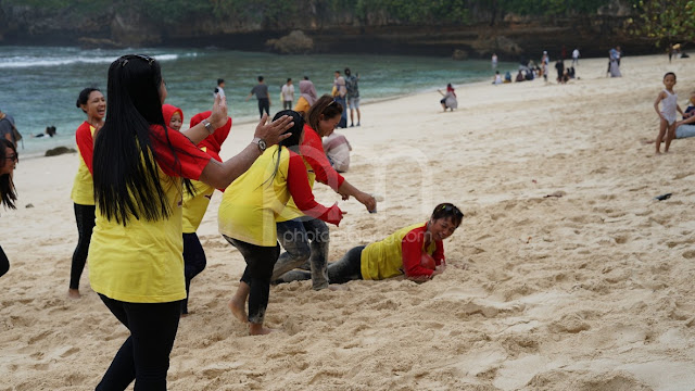 Dari tempat parkir mobil menuju pantai, kita harus berjalan dengan medan naik, dan turun. Tapi medan tersebut masih dalam kategori normal dan wajar, anak-anak dan orang dewasa masih bisa berjalan dengan normal.