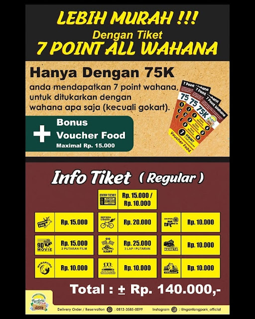 hanya dengan 75 ribu anda mendapatkankan 7 Point yang bisa ditukarkan dengan semua wahana di Ngantang Park + anda masih mendapat bonus voucher food senilai 15 ribu.
