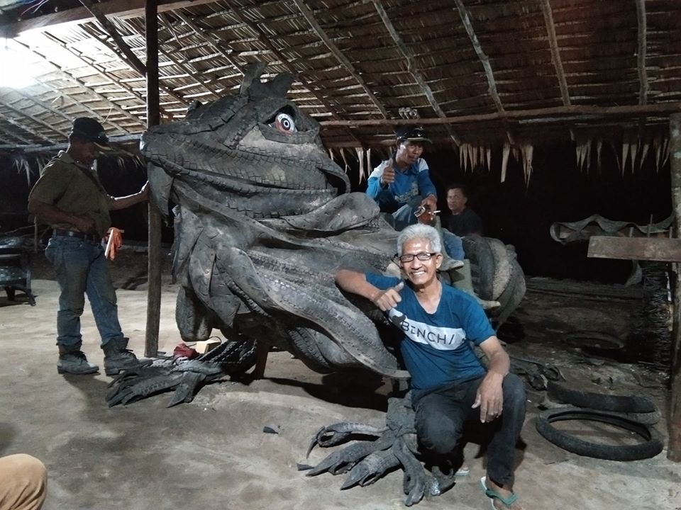 Nana Bintan seorang seniman asal Kepanjen Malang, memanfaatkan ban bekas menjadi patung raksasa dengan berbagai bentuk.