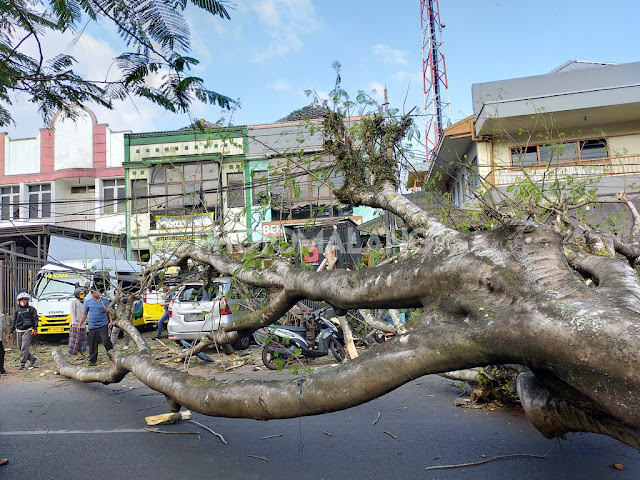 Pohon besar dan berusia sudah lama tiba - tiba tumbang dan mengarah ke jalan raya. Akibatnya beberapa korban luka dan 2 kendaraan rusak pada Hari Sabtu 1 Agustus 2020 sekitar pukul 16.00 Wib ( sore hari )