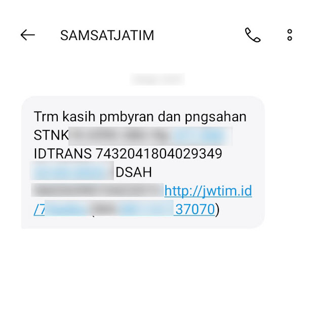 6. Cek inbox SMS di ponsel, dari SAMSAT JATIM , isinya informasi link Tanda bukti Pajak Tahunan berupa file pdf ( via download )
